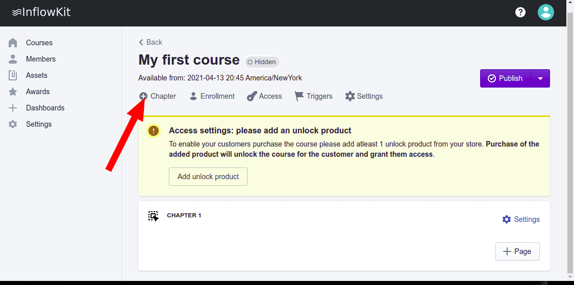 - On the Courses page, click edit on the course you’d like to add chapters to, click the + Chapter button as shown below
