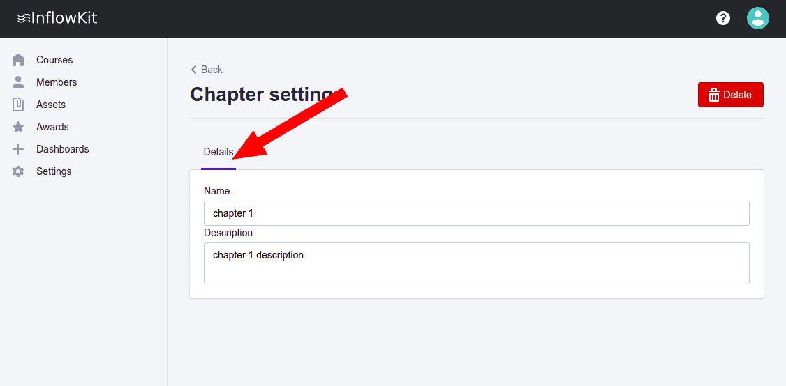 How to edit chapter detailsLearn how to update chapter details.Published on 1/2/2020Update chapter details On the course details page, identify the chapter you’d like to edit then click settings on the far right. On the chapter settings page, select Details tab. You can now change the Name and description of the chapter. You can also delete it by clicking Delete on the top right corner.
